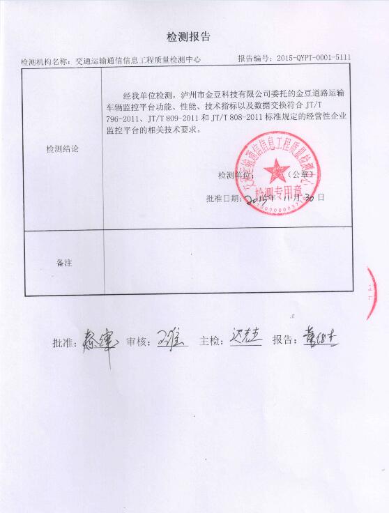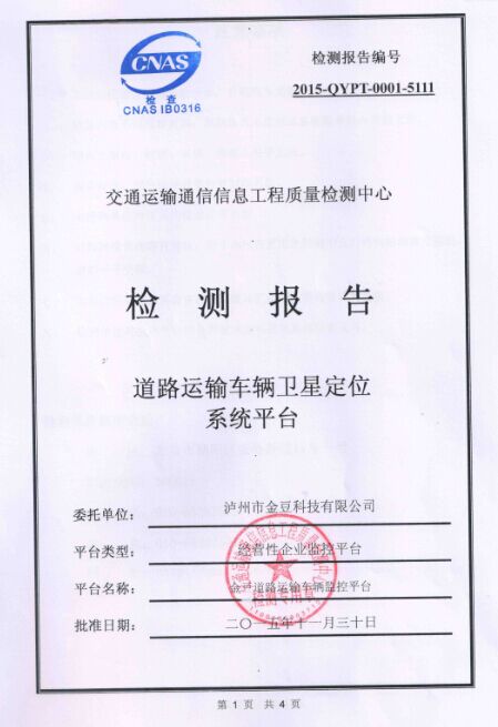 金豆道路運(yùn)輸車(chē)輛GPS監(jiān)控平臺(tái)已于2014年4月接入四川省交通廳道路運(yùn)輸管理局,已于2015年11月通過(guò)中華人民共和國(guó)交通部符合性檢測(cè)。至此,金豆科技成為瀘州市一家取得交通部資質(zhì)的GPS運(yùn)營(yíng)商,為深化服務(wù)體系邁向了更加堅(jiān)定的腳步。